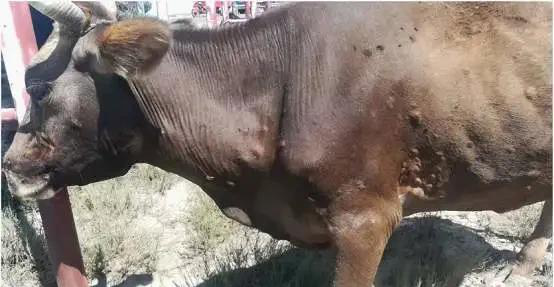 得了牛结节性皮肤病怎么办?防治与预防有妙招!发表时间:2020-11-24 16:33 德成动保|微信号:scdcdb 养殖人都在关注的微信公众号 订货热线:13880310505 牛结节性皮肤病 全面剖析 ![]() 在我国新疆边境,哈萨克斯坦国流行着一种牛结节性皮肤病,是一种病毒性传染病,它能通过蚊蝇等节肢昆虫传播,严重损坏牛的 皮肤 ,影响皮张加工与销售。在与其相邻的我国新疆维吾尔地区养殖密度非常的大,一旦传入我国将对我国的养牛业造成非常严重的危害。具前不久国家权威部门报道,本病已于2019年8月12日传入我国,这是我国首次确诊发生该病。经当地畜牧兽医部门排查,截至目前,共在伊犁州察布查尔县、霍城县、伊宁市发现病牛218头,死亡1头。传入后,对我国的奶牛和肉牛养殖会造成严重的经济损失。为了提高大家对本病的认识,现介绍如下。 一、什么是牛结节性皮肤病 牛结节性皮肤病又称牛皮肤疙瘩病,是有一种痘病毒科羊痘病毒属的DNA病毒所致。多流行在撒哈拉以南非洲和马达加斯加等地方的地方性疾病。在埃及和以色列也出现过。牛结节性皮肤病(lumpy skin disease,LSD)是牛的一种传染病,LSDV是一种痘病毒,与牛痘病毒差异很大,而与绵羊痘病毒(sheep pox virus,SPPV)和山羊痘病毒(goat pox virus,GPV)相似,同属于山羊痘病毒属(Capripoxvirus)。LSDV是大的双链DNA有囊膜的病毒,在冬季和干燥情况下,该病毒在环境中存活能力很强。虽然许多消毒剂能够杀灭该病毒,但此类消毒剂往往难以杀灭发病动物脱落的痘疹痂皮中的病毒。 ![]() 二、牛结节性皮肤病的流行病学 病毒可在被感染牛的唾液中存在,该病可以通过被污染得环境感染。但是最主要的传播方式是节肢昆虫媒介的机械传播,也就是蚊蝇的叮咬,所以在以往流行地区多发生在雨后的昆虫活动,所以说这种疾病与雨季有关。随着蚊蝇叮咬机械传播的病毒,通过白细胞相关的病毒血症在机体内迅速的发展。该病不是人畜共患病 ,发病率在 5% ~45% 之 间 ,死亡率通常低于10% 。目前国内暂时还没有同源性的疫苗,只能用药物和羊痘疫苗来进行防治。发生疫情因限制同群牛移动,禁止发生疫情区域活牛调出。做好同群牛临床监视,对养殖场环境进行彻底清洗、消毒,灭杀蚊蝇等昆虫媒介。 三、牛结节性皮肤病的临床症状 该病的潜伏期14天,症状有持续发热,伴有流泪、流鼻涕和产奶量下降。浅表淋巴结严重肿大,四肢依赖性组织水肿。出现边界清晰的皮肤结节,尤其在头部、颈部、乳房和阴部。口咽、会厌、舌和整个消化道黏膜都有痘性病变。(有些皮肤病变可能)发展为“鞍坏疽”这些结构由一个坏死组织的中央栓组成,其脱落后留下深的溃疡(如下图)。继发细菌感染,或感染蝇蛆病可以导致症状恶化。可能需要几个月的时间痊愈。受影响的动物都是虚弱的母牛或是妊娠的母牛。疾病的严重程度与病毒株和牛的品种有关。黄牛比瘤牛更易感。有些动物很少有皮肤病变和全身反应,其他的动物显示出遍及全身的临床症状。虽然死亡率通常5%,但是疾病导致的经济影响是相当大的。临床症状多种,部分牛身上起结节,髋、腕、趾部肿胀发炎,大多牛使用常规抗生素也会反复无常。采食量稍微有所降低。如不尽早防治,发病后好了会引起皮张质量,影响后期增长。有些牛出现皮肤结节溃烂,这种牛一般不用怕,正在排毒,尽早防治一般不会死。如有部分牛续发肺炎,如不尽早防治,死亡率就非常高。