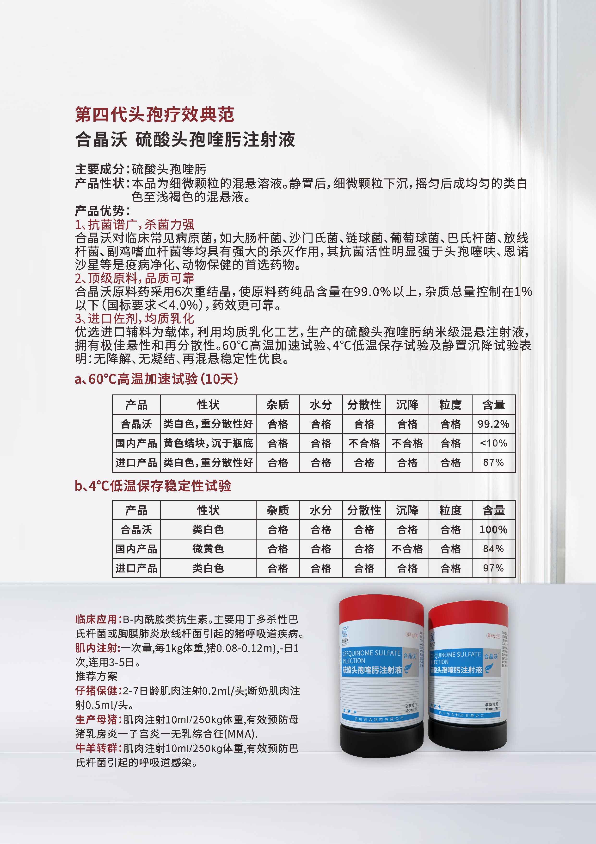 合晶沃对临床常见病原菌,如大肠杆菌、沙门氏菌、链球菌、葡萄球菌、巴氏杆菌、放线杆菌、副鸡嗜血杆菌等均具有强大的杀灭作用,其抗菌活性明显强于头孢噻呋、恩诺沙星等是疫病净化、动物保健的首选药物。